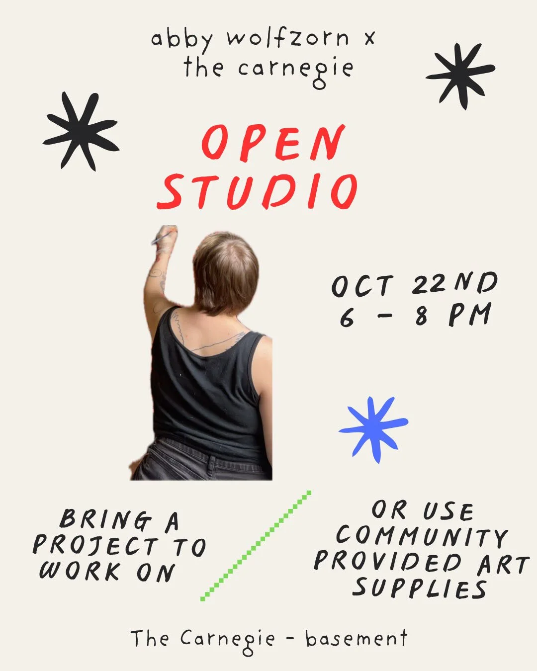 Join Carnegie Artist Abby Wolfzorn for Open Studio! Bring a project to work on or use community provided art supplies. All are welcome to join in!